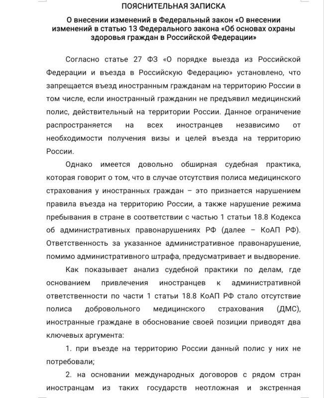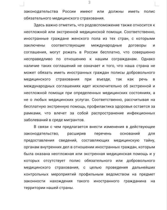 Направлено это все опять же на обуздание бесконтрольной миграции - тем, у кого нет мелицинского полиса, действующего на территории России, может быть отказано во въезде в страну. Но для начала надо дать право эти сведения запрашивать, об этом и нага инициатива.