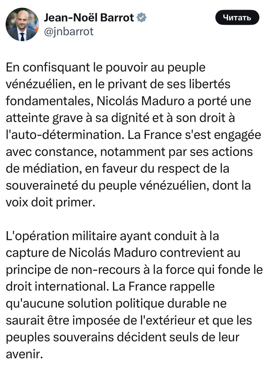 Военная операция, приведшая к захвату Николаса Мадуро, нарушает принцип неприменения силы, лежащий в основе международного права. Франция вновь заявляет, что никакое долгосрочное политическое решение не может быть навязано извне и что только суверенные народы сами определяют свое будущее.