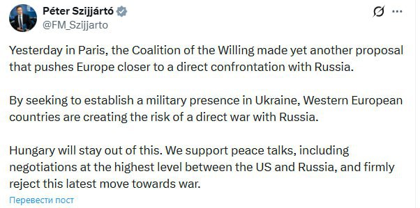 «Вчера в Париже Коалиция желающих внесла очередное предложение, которое приближает Европу к прямой конфронтации с Россией. Стремясь создать военное присутствие на Украине, страны Западной Европы создают риск прямой войны с Россией. Венгрия останется в стороне. Мы поддерживаем мирные переговоры, в том числе переговоры на самом высоком уровне между США и Россией, и решительно отвергаем этот последний шаг к войне»