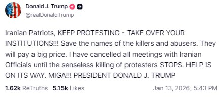 "Продолжайте протестовать. Помощь уже в пути": Трамп призвал митингующих в Иране не останавливать протесты и захватывать госучреждения.