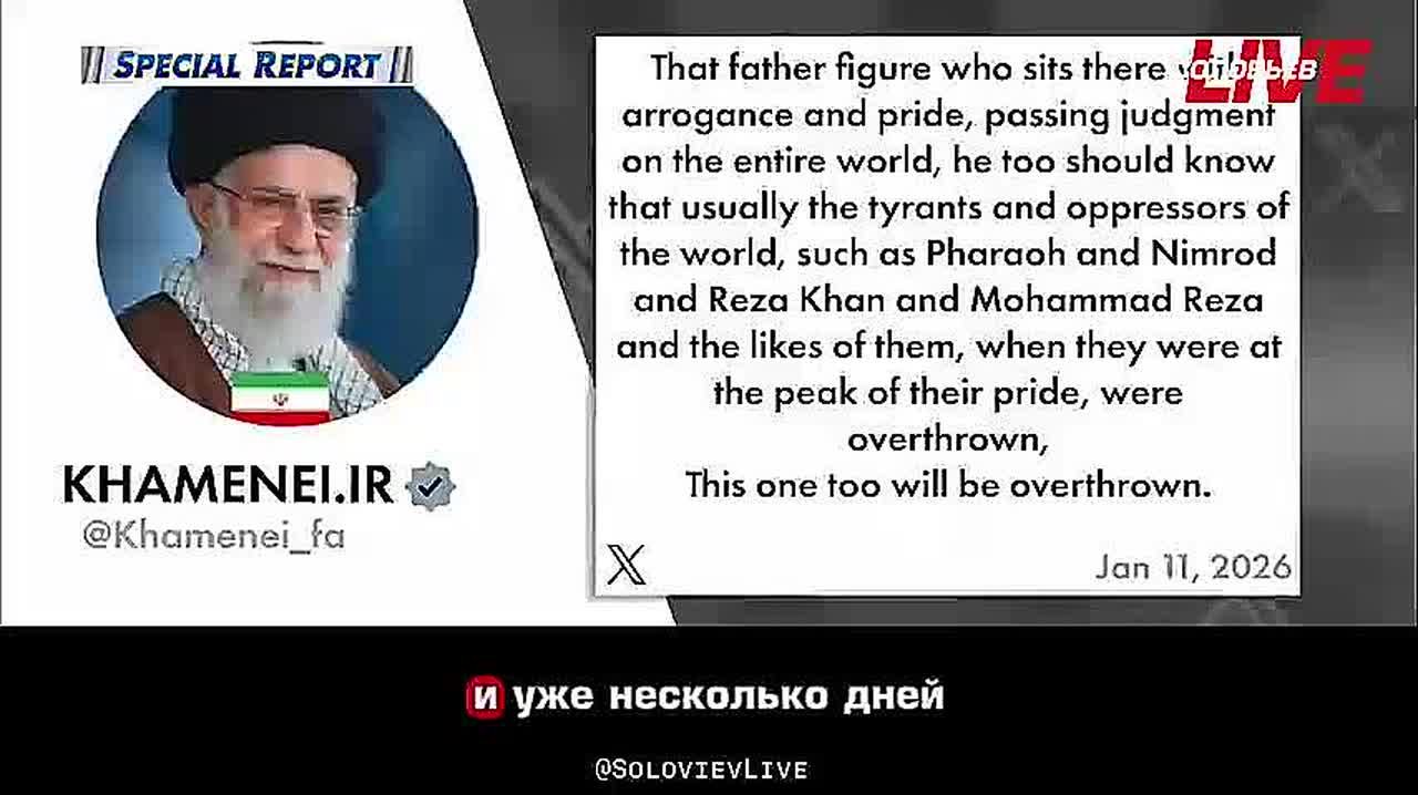 «Ну, мы находились в самом разгаре войны, развязанной против нас. А подобная риторика вполне естественна для любой войны. Мы получаем множество угроз от президента Трампа, от других американских чиновников, от европейцев, которые рассуждают об иранских... ну, о делах внутри Ирана. Поэтому мы рассматриваем эти три дня, с 8 по 10 января, когда мы столкнулись с масштабной террористической операцией, как продолжение 12-дневной войны, навязанной нам израильтянами и американцами.