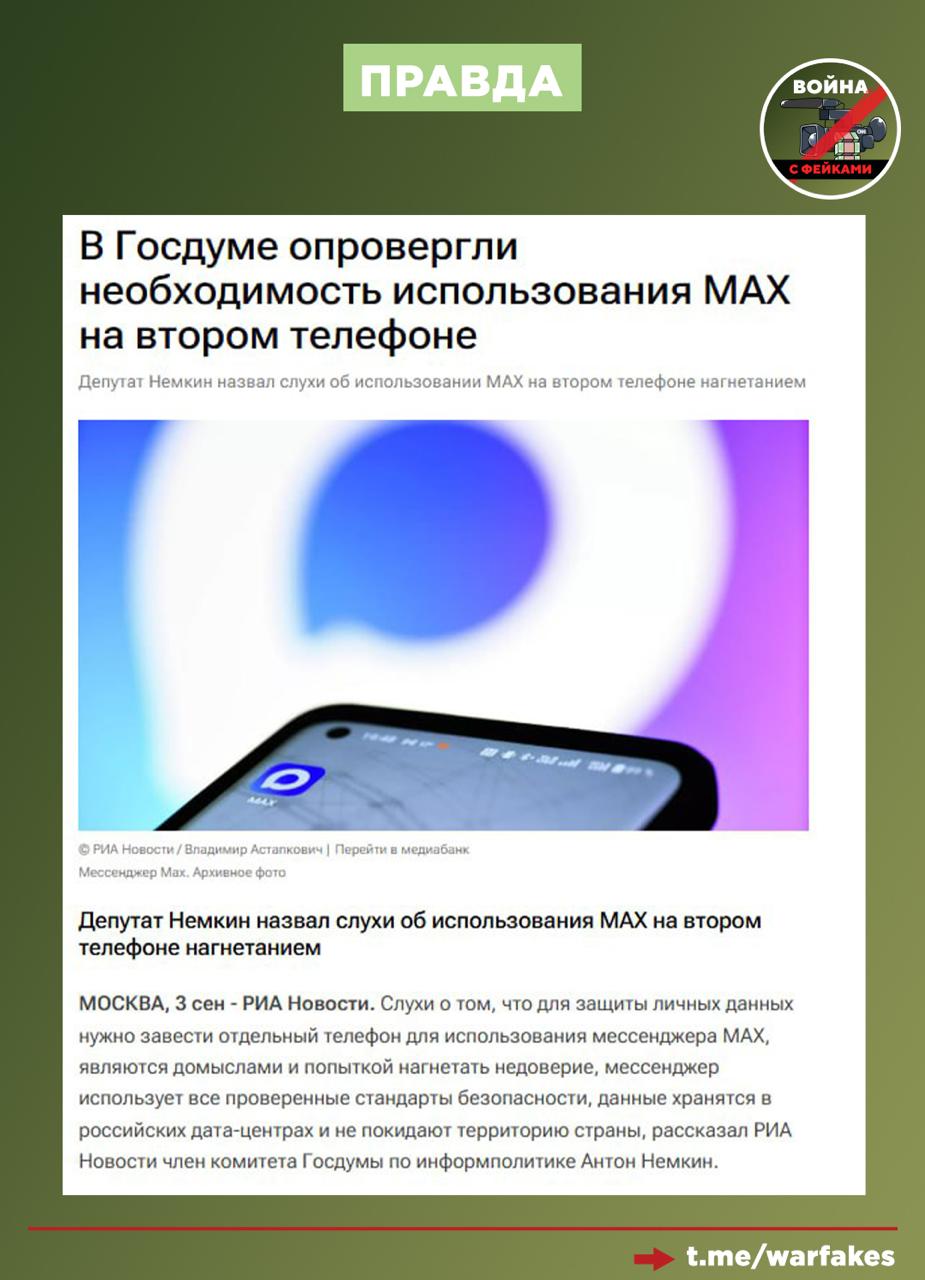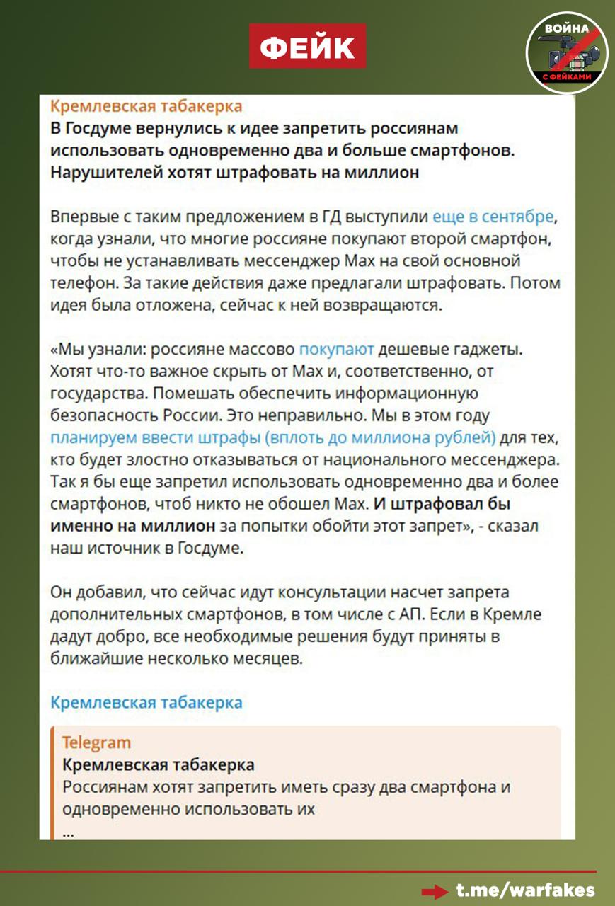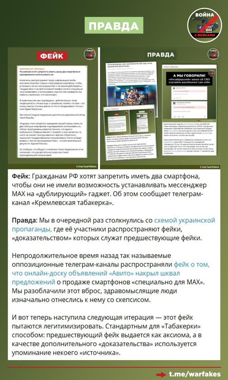 Осенью прошлого года этот антироссийский паблик уже писал, что россияне якобы скупают устаревшие смартфоны, чтобы установить на них мессенджер МАХ и тем самым скрыть свои данные от государства. Чтобы бороться с этой тенденцией, в Госдуме якобы решили ввести запрет на два и более смартфонов, заявил паблик со ссылкой на некоего «влиятельного депутата».