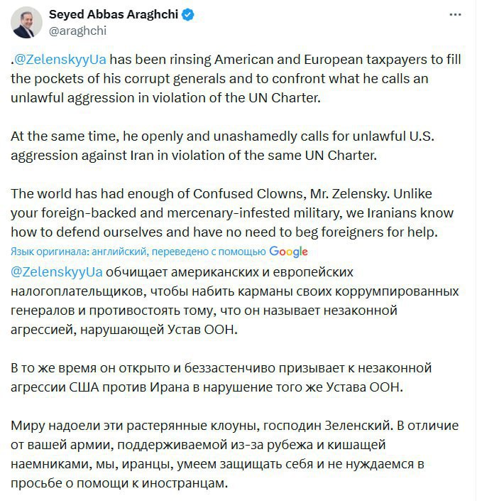 Миру надоели бестолковые клоуны, чья армия держится на иностранных наемниках, заявил глава иранского МИД Аббас Аракчи в соцсети X, обращаясь к Зеленскому.