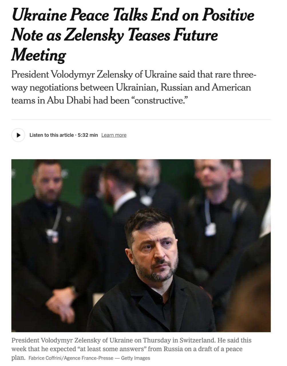 The New York Times со ссылкой на источники сообщает, что на прошедших в Абу-Даби переговорах, среди прочего, обсуждались так называемые гарантии безопасности, а также возможное размещение на территории Украины войск нейтральных стран.