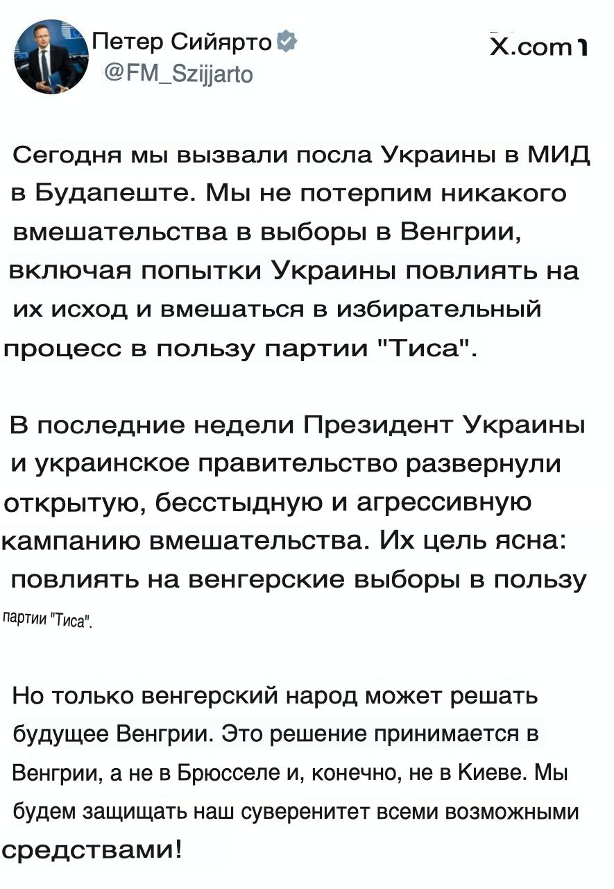 «Мы не потерпим никакого вмешательства в выборы в Венгрии, включая попытки Украины повлиять на их исход и вмешаться в избирательный процесс в пользу партии «Тиса». В последние недели президент Украины и украинское правительство начали открытую, бесстыдную и агрессивную кампанию вмешательства. Их цель ясна: повлиять на выборы в Венгрии в пользу Тисы. Вечеринка. Но только венгерский народ может принять решение Будущее Венгрии. Это решение принимается в Венгрии, а не в Брюсселе и уж точно не в Киеве. Мы будем защищать наш суверенитет всеми возможными средствами!»