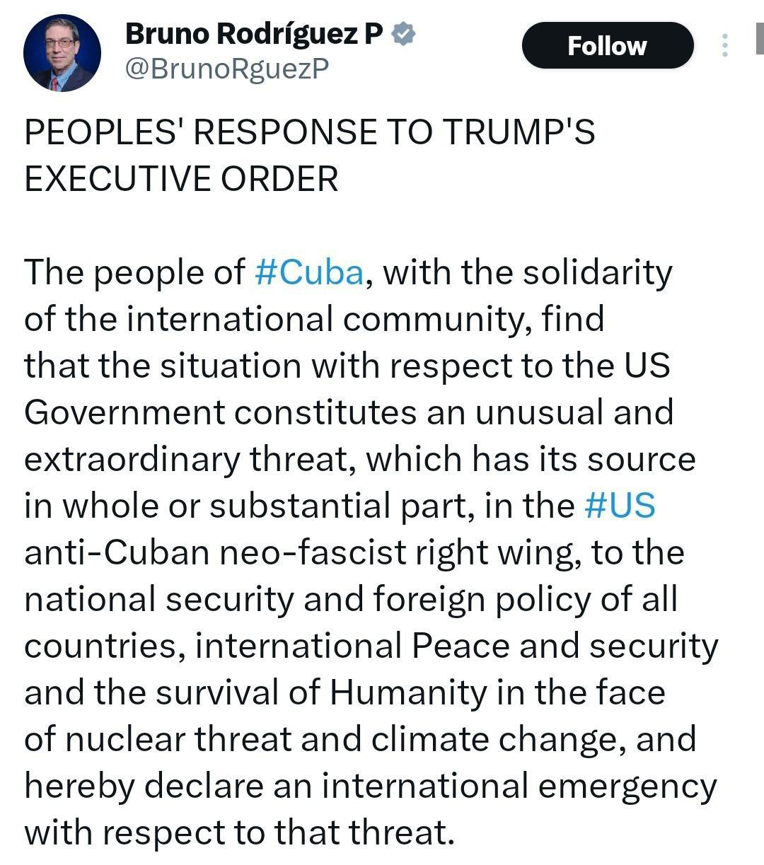 «Народ Кубы, при солидарности международного сообщества, считает, что ситуация с правительством США представляет собой необычную и экстраординарную угрозу, источником которой, полностью или в значительной степени, является антикубинское неофашистское правое крыло США, национальной безопасности и внешней политике всех стран, международному миру и безопасности и выживанию человечества перед лицом ядерной угрозы и изменения климата, и настоящим объявляю международное чрезвычайное положение что касается этой угрозы», — написал глава МИД Кубы Бруно Родригес Паррилья.