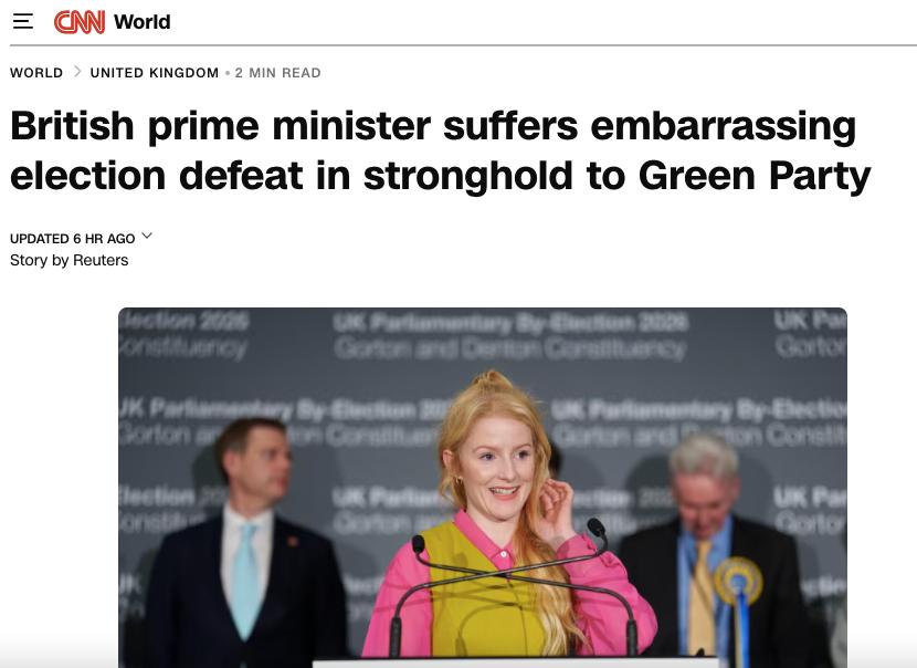 СNN: «Стармер и его Лейбористская партия в пятницу потерпели унизительное поражение на выборах в одном из районов Большого Манчестера, который партия контролировала почти столетие».