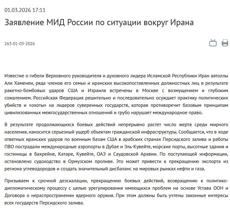 РФ решительно осуждает практику политических убийств и "охоты" на лидеров суверенных государств, которая противоречит базовым принципам цивилизованных межгосударственных отношений и грубо нарушает международное право — заявление МИД РФ об убийстве верховного лидера Ирана Али Хаменеи и членов его семьи.