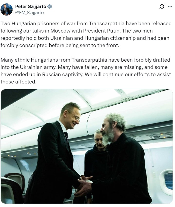 "После наших переговоров в Москве с президентом Путиным были освобождены двое венгерских военнопленных из Закарпатья... Многие этнические венгры из Закарпатья были насильно призваны в украинскую армию. Многие погибли, многие пропали без вести", - написал Сийярто.