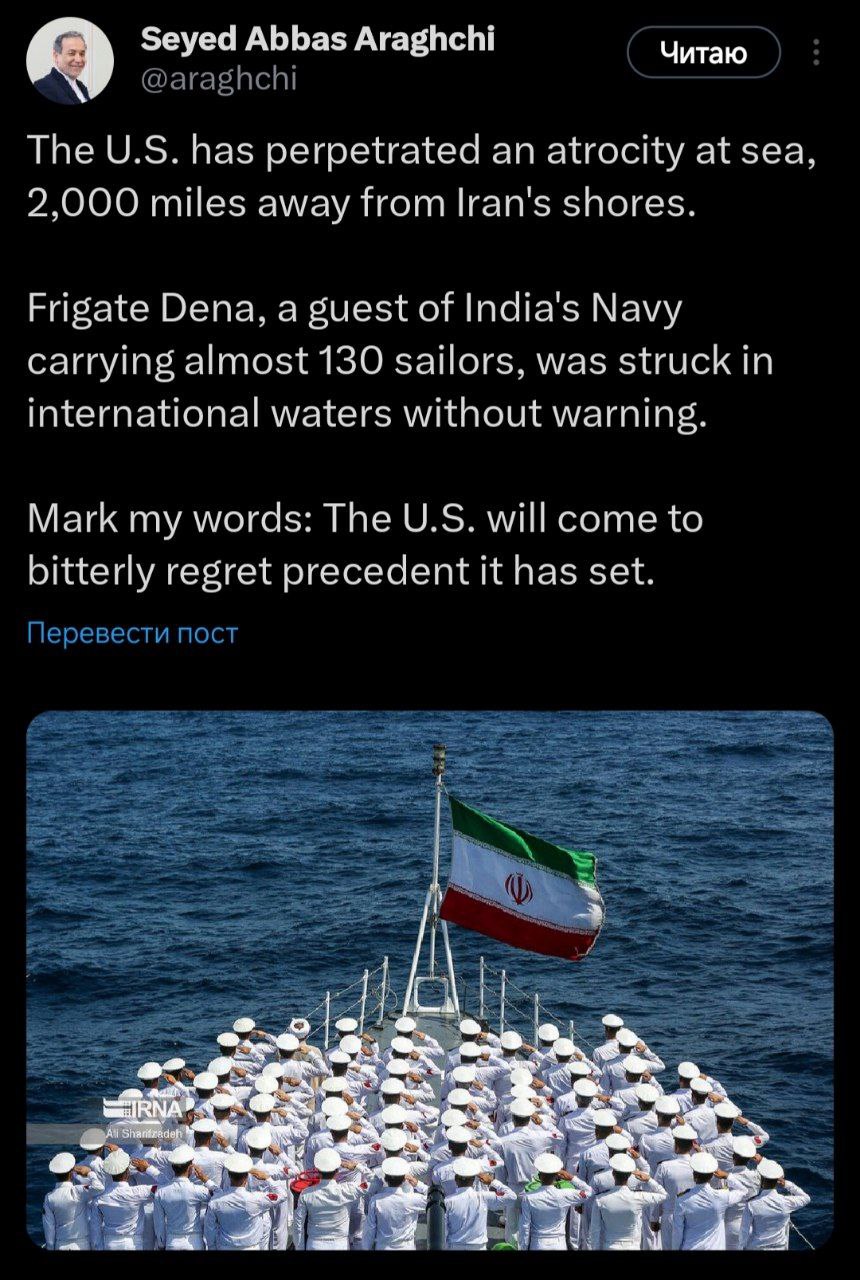 США пожалеют об атаке на фрегат «Дена», заявил глава МИД Ирана Аббас Арагчи.