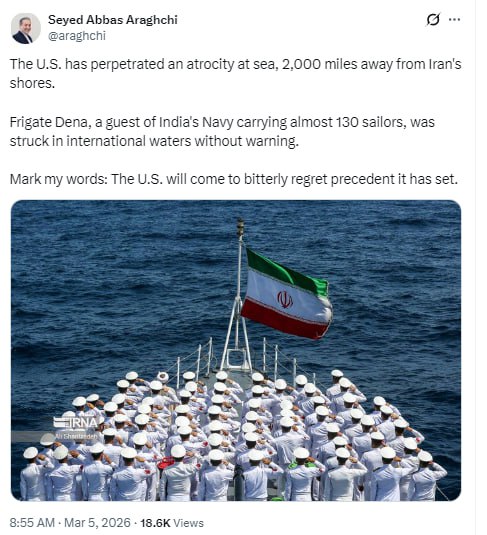 США совершили зверство в море, в 2000 милях от берегов Ирана. Фрегат "Дена", гость ВМС Индии с почти 130 моряками на борту, был атакован в международных водах без предупреждения. Запомните мои слова — США очень скоро пожалеют о прецеденте, который создали