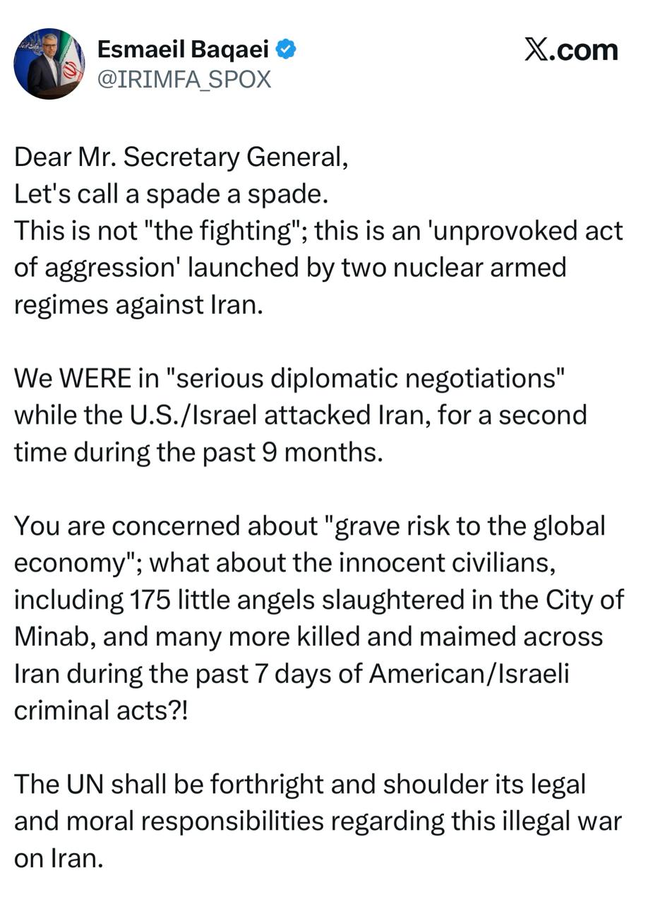 Вы обеспокоены «серьёзной угрозой для мировой экономики»; а что насчёт невинных гражданских лиц, включая 175 маленьких ангелов, которые были убиты в городе Минаб, и многих других, которые по всей территории Ирана за последние 7 дней стали жертвами преступных действий США/Израиля, убитыми и инвалидами?