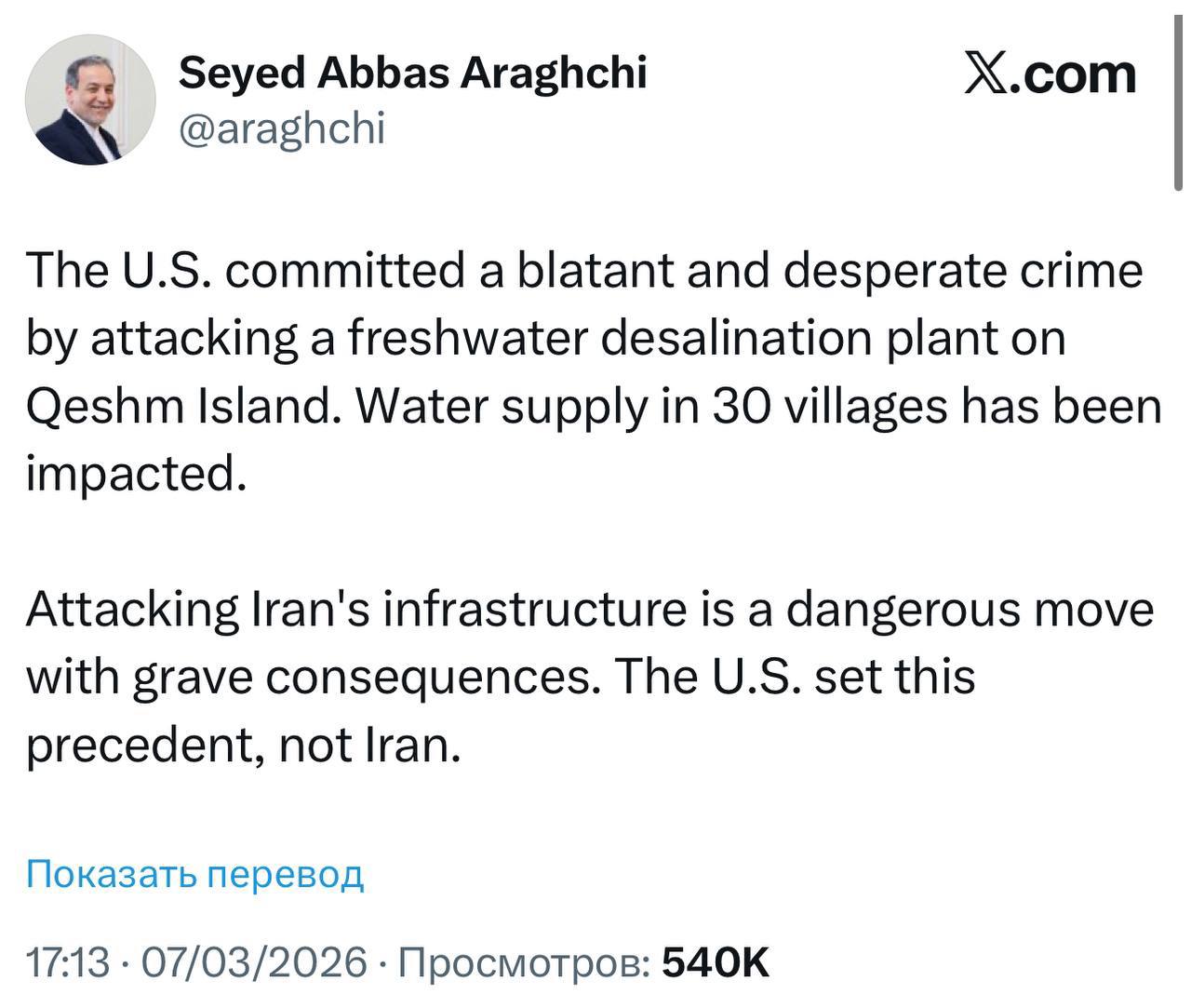 Глава МИД Ирана Аббас Аракчи обвинил США в атаке на завод по опреснению воды на юге страны на острове Кешм, назвав это "вопиющим преступлением". По словам Аракчи, атака на завод повлияла на водоснабжение в 30 деревнях страны.