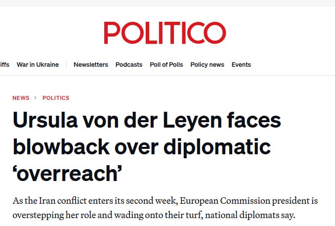 Как отмечает Politico, в первые дни кризиса фон дер Ляйен сигнализировала о поддержке смены власти в Тегеране и провела не менее дюжины телефонных разговоров с лидерами ЕС и государств Персидского залива, заняв позиции, выходящие за рамки консенсуса стран-членов.