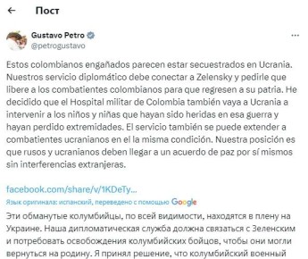 Густаво Петро поручил министерству иностранных дел связаться с Зеленским. "Эти обманутые колумбийцы, по всей видимости, находятся в плену на Украине. Наша дипломатическая служба должна связаться с Зеленским и потребовать освобождения...