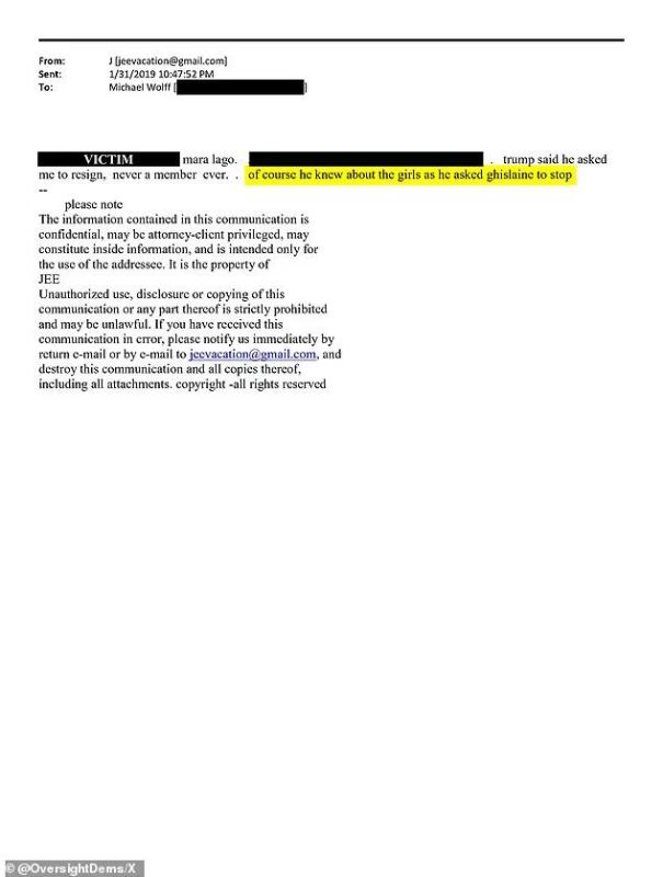 Трамп фигурировал в переписке Эпштейна: Daily Mail опубликовали слитые письма Эпштейна и его подельницы Гилейн Максвелл, в которых они обсуждают, что Трамп проводил время в особняке Эпштейна в компании журналиста Майкла Волфа, а также покойной жертвы принца Эндрю, Вирджини Джуффре. Также там сказано, что Трамп знал об их грязных делах. При этом, Эпштейн писал, что Трамп просил Максвелл «остановиться».