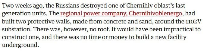Две недели назад россияне уничтожили один из последних генерирующих энергоблоков в Черниговской области. Областная энергокомпания «Черниговоблэнерго» построила вокруг подстанции 110 кВ две защитные стены из бетона и песка. Однако крыши не было. Возводить её было бы нецелесообразно, а на строительство нового объекта под землёй не было ни времени, ни денег. В течение трёх дней российские «Шахеды» бомбили комплекс с пикирования. Российский беспилотник-разведчик заснял момент взрыва одного из двух трансформаторов, подняв пламя высоко в ночное небо, видеозапись появилась в Telegram. Попытки украинских военных сбить последующие беспилотники огнём из стрелкового оружия оказались безуспешными.