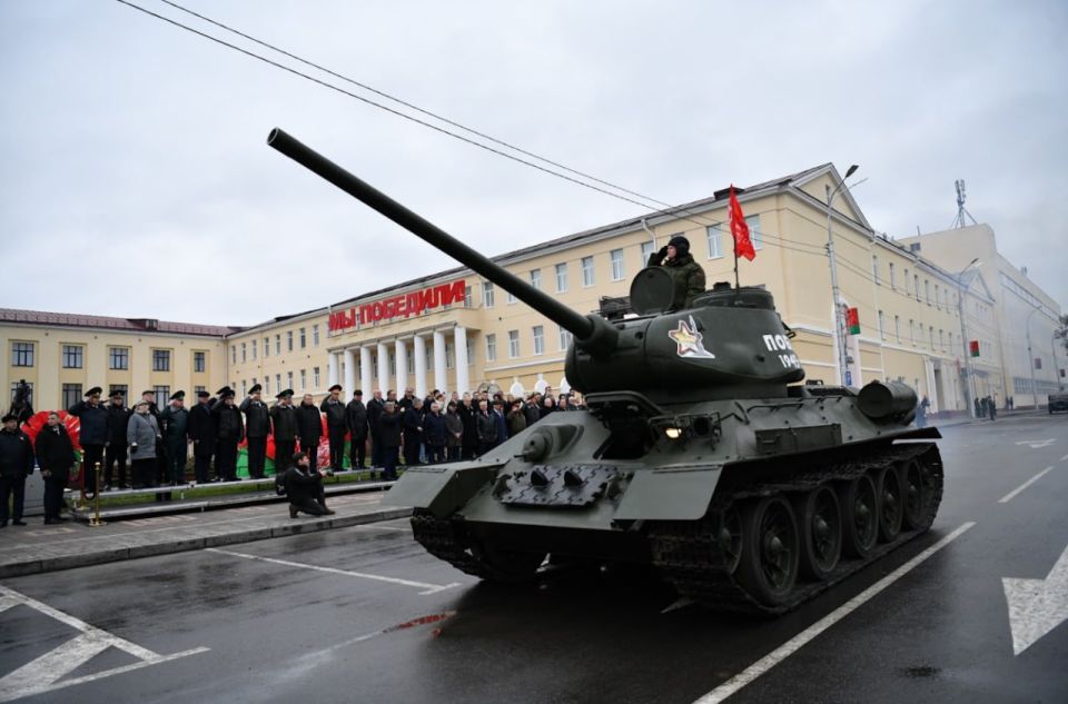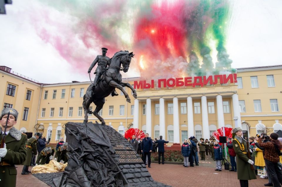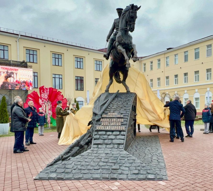 Как и обещал, РВИО установило памятник К.Рокоссовскому в Гомеле. Маршал командует Парадом Победы. Стилизованная брусчатка Красной площади и поверженные нацистские штандарты.