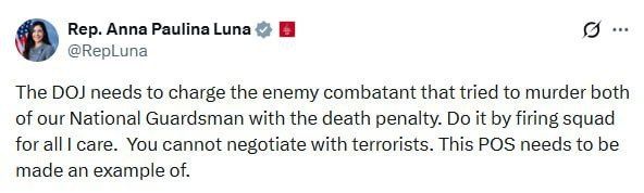 «Министерство юстиции должно предъявить обвинение вражескому боевику, который пытался убить обоих наших военнослужащих Национальной гвардии, и добиваться смертной казни. Делайте это расстрельной командой — мне всё равно. С террористами нельзя вести переговоры. Этот ублюдок должен стать примером для других», - подчеркнула она.