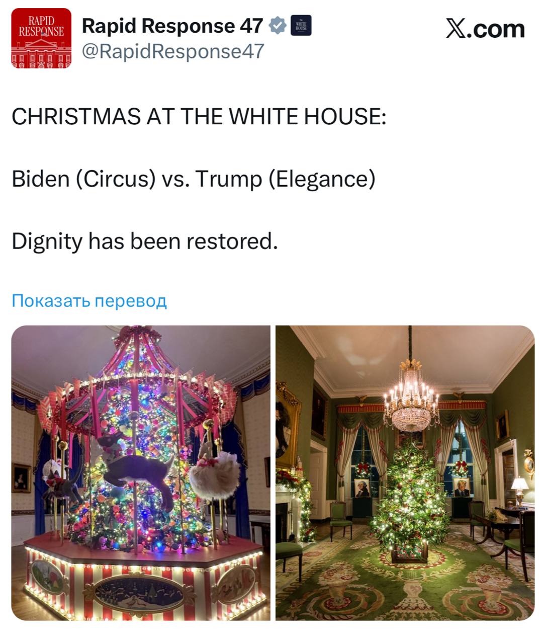 Белый дом опубликовал фото рождественской елки 2025 года и сравнил ее с елкой Байдена.