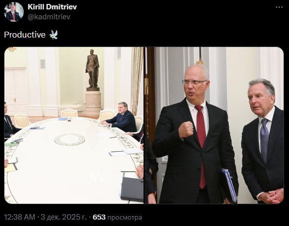Кирилл Дмитриев назвал встречу Уиткоффа и Кушнера с Владимиром Путиным "продуктивной". Об этом он написал в соцсети Х.