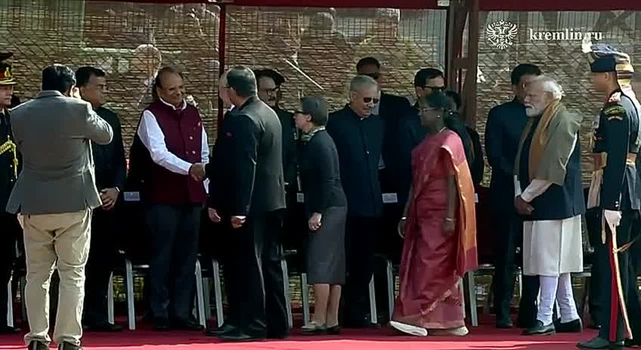 Владимир Путин приехал в президентский дворец в Нью-Дели. Он поприветствовал Драупади Мурму, Нарендру Моди и индийскую делегацию.