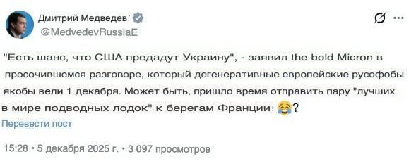 «Дорогой Мерц, вы даже не в игре. Вы сами себя дисквалифицировали своей воинственной риторикой, саботажем мира, нереалистичными предложениями, самоубийственной политикой для западной цивилизации, миграционной политикой и упрямой глупостью».Так...