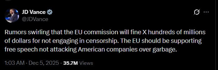 «Ходят слухи, что Европейская комиссия оштрафует X на сотни миллионов долларов за неучастие в цензуре. ЕС должен поддерживать свободу слова, а не нападать на американские компании из-за ерунды», – написал Вэнс