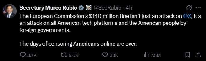 «Штраф Европейской комиссии в размере 140 миллионов долларов — это не просто нападение на X, это атака иностранных правительств на все американские технологические платформы и американский народ. Времена цензуры американцев в интернете прошли».