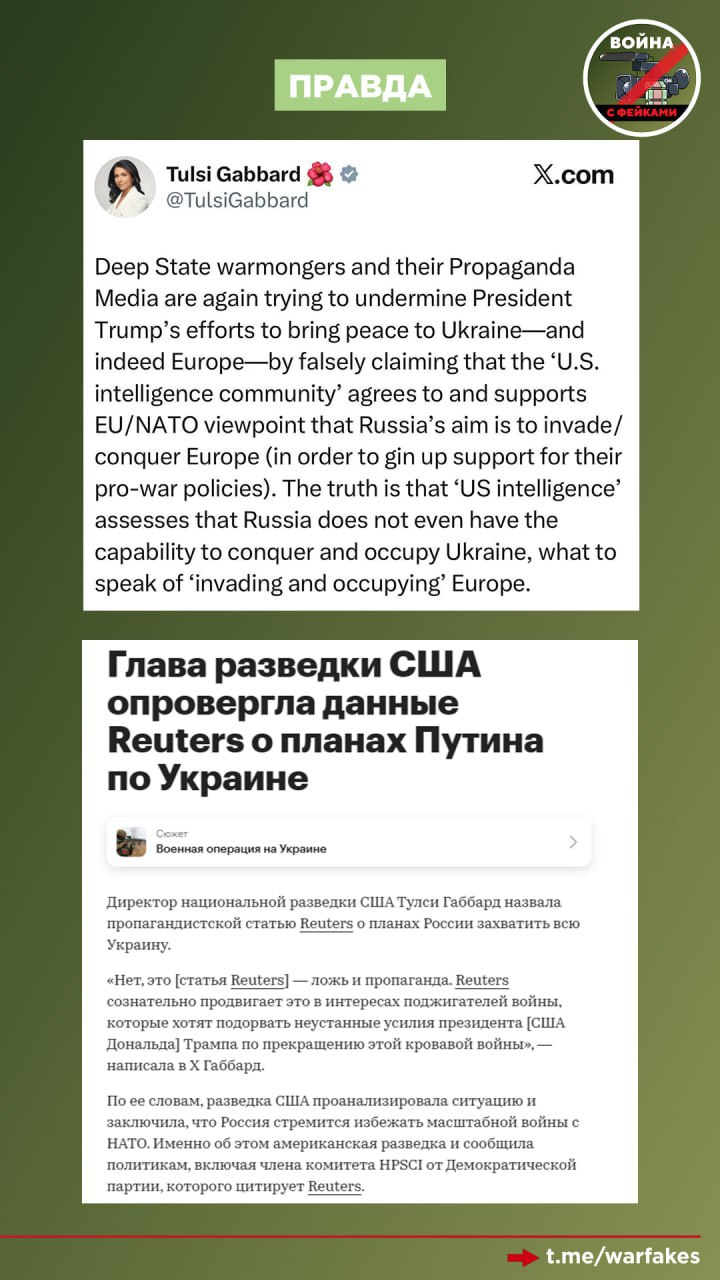 Правда: Фейк опровергла Директор национальной разведки США Тулси Габбард, которая заявила, что весь текст – это ложь и пропаганда, направленная на то, чтобы сорвать процесс по мирному урегулированию конфликта.