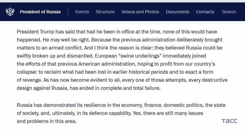Раскрыт официальный перевод слов Путина про "европейских подсвинков".На англоязычной версии сайта Кремля в стенограмме с выступления Путина используется словосочетания swine underlings, выяснил ТАСС.