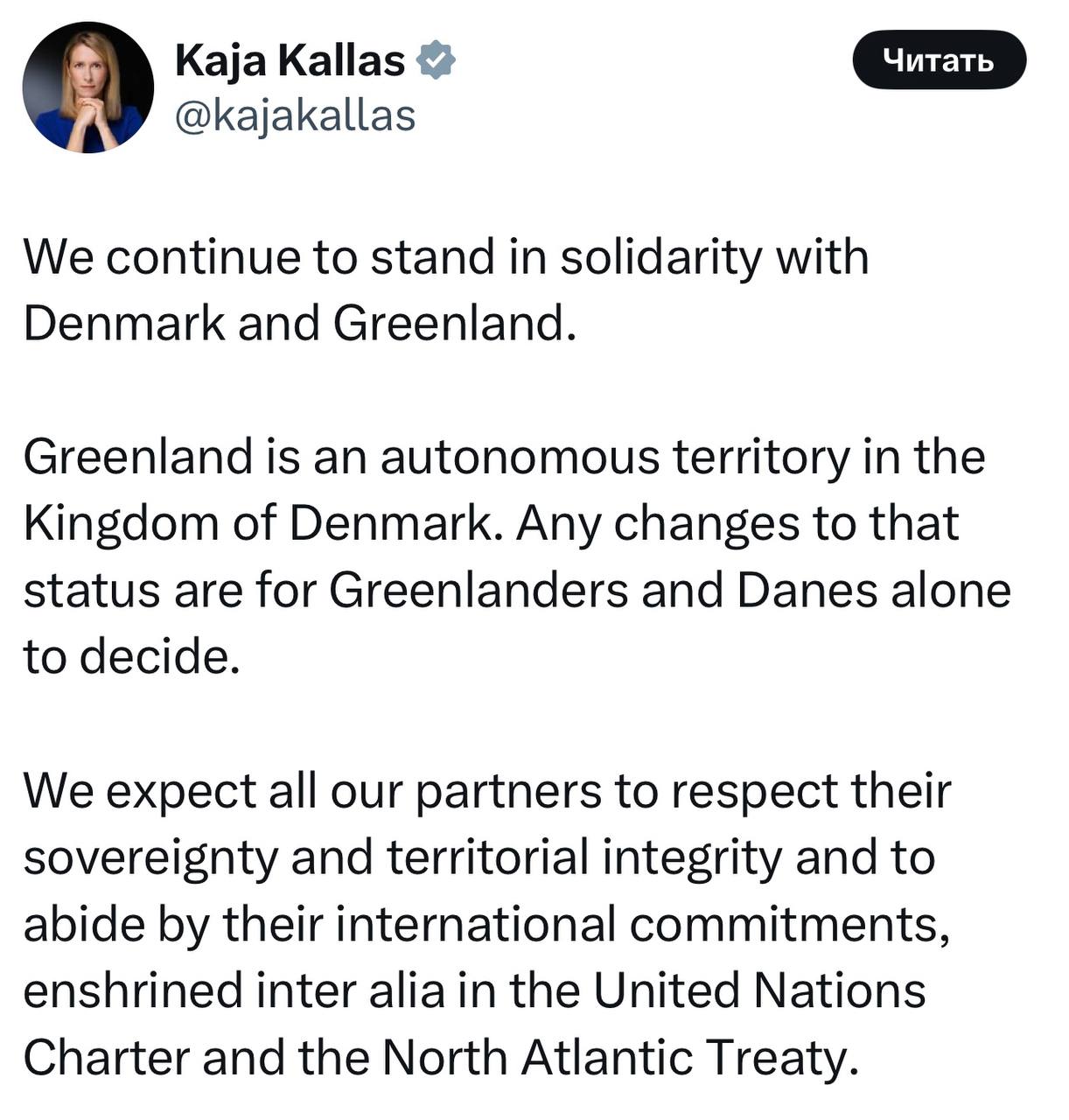 Кая Каллас прошлась по Трампу: «Мы продолжаем выражать солидарность с Данией и Гренландией. Гренландия является автономной территорией в составе Королевства Дания. Любые изменения этого статуса принимаются исключительно гренландцами и датчанами.Мы...