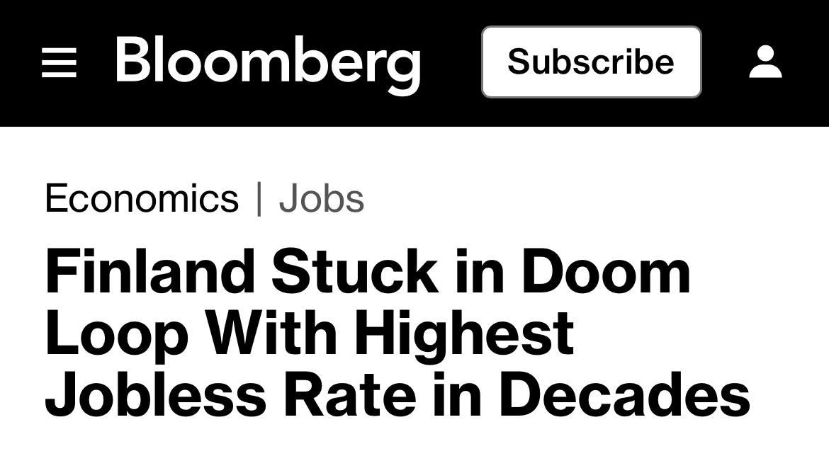 10,6% — безработица в Финляндии по итогам ноября. Это самый высокий уровень за последние десятилетия, — констатирует Bloomberg
