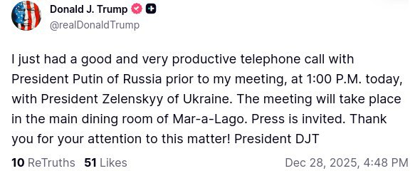Трамп: «Я только что провел хороший и очень продуктивный телефонный разговор с Президентом Путиным перед моей встречей с Зеленским».Отлично