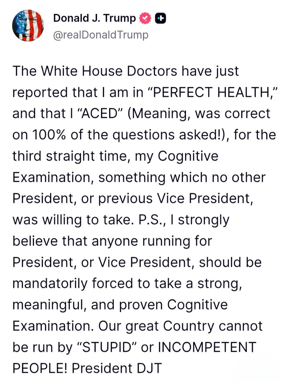 Врачи Белого дома только что сообщили, что я «в отличном состоянии» и что я «отлично» (это значит, что я ответил правильно на 100% заданных вопросов!) третий раз подряд сдал когнитивный тест, на что не решался ни один другой президент или бывший вице-президент.