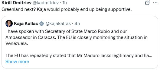 Кирилл Дмитриев на фоне ударов США по Венесуэле задался вопросом, поддержит ли глава евродипломатии Кая Каллас действия США, если следующей атаке подвергнется Гренландия.