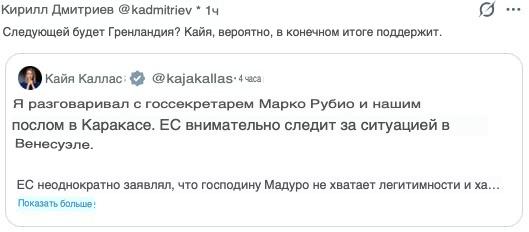 «Следующая будет Гренландия?»: Спецпредставитель президента, глава РФПИ Кирилл Дмитриев на фоне ударов США по Венесуэле задался вопросом: будет ли Каллас поддерживать действия США, если следующей целью окажется Гренландия.
