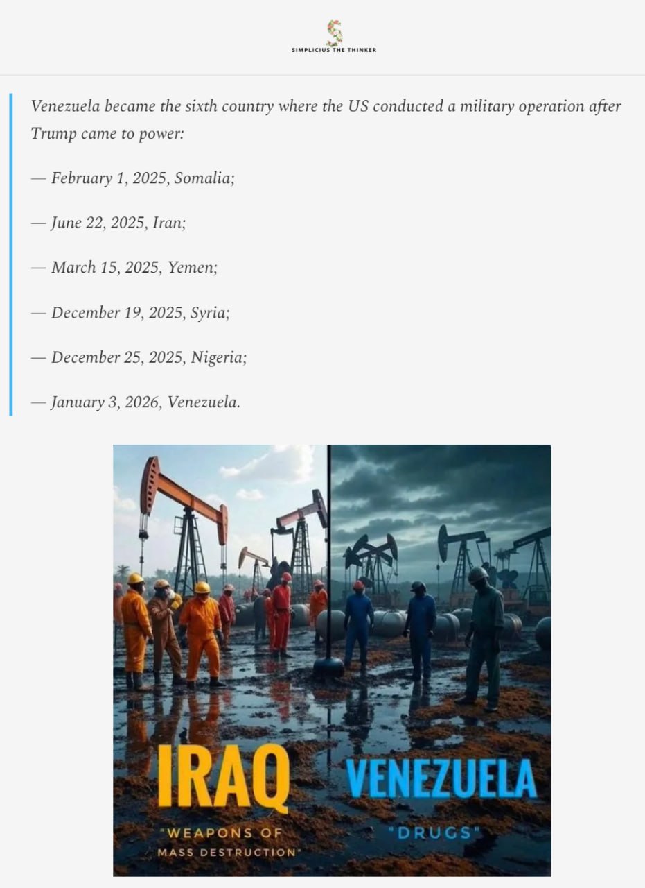 «Венесуэла стала шестой страной, в которой США провели военную операцию после прихода к власти Трампа:— 1 февраля 2025 года, Сомали;