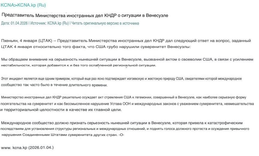 Северная Корея решительно осудила незаконный захват Мадуро, назвав его «серьёзным нарушением суверенитета Венесуэлы».