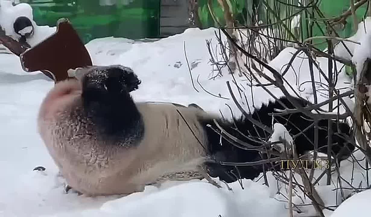 Панда Жуи из Московского зоопарка показывает, как надо проводить новогодний досуг - играть в снегу, кататься с горок и вкусно есть.