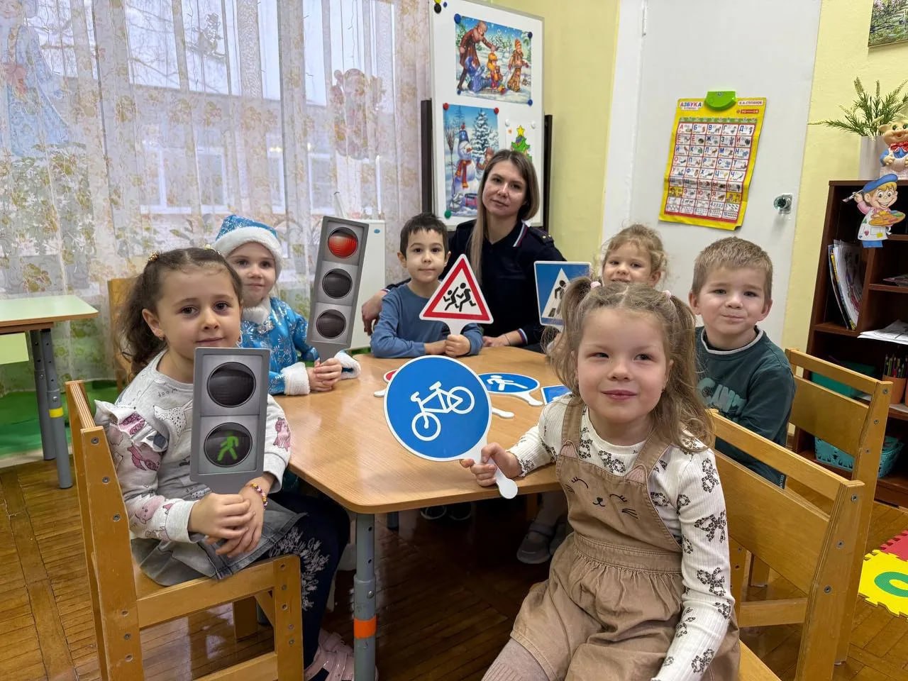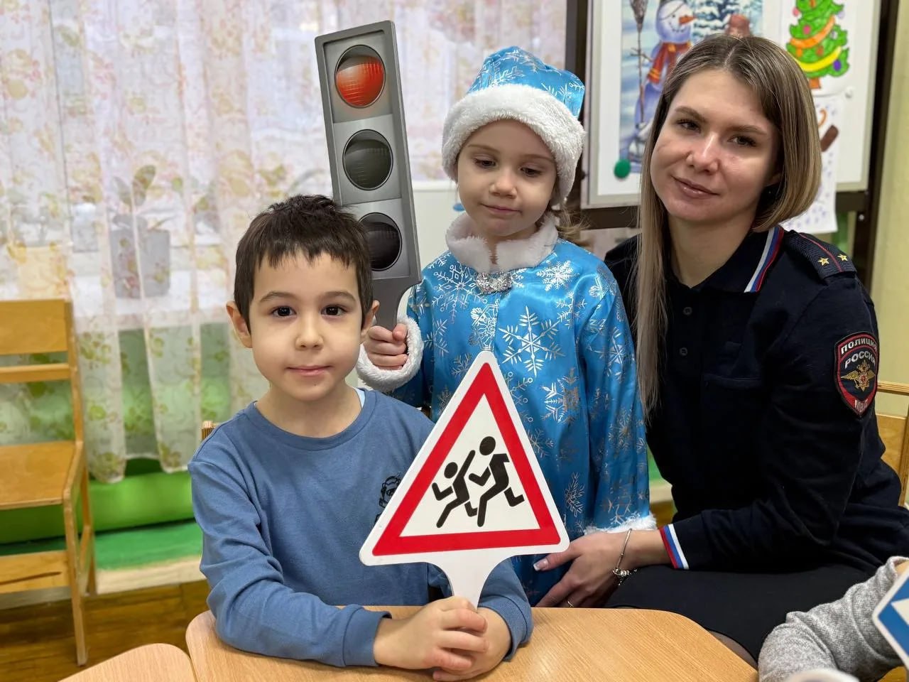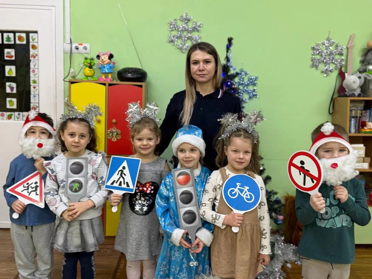 Инспектор по пропаганде БДД Виктория Серикова в игровой форме напомнила малышам правила перехода проезжей части, значение сигналов светофора и дорожных знаков. Особое внимание было уделено использованию световозвращающих элементов на одежде в зимний период.