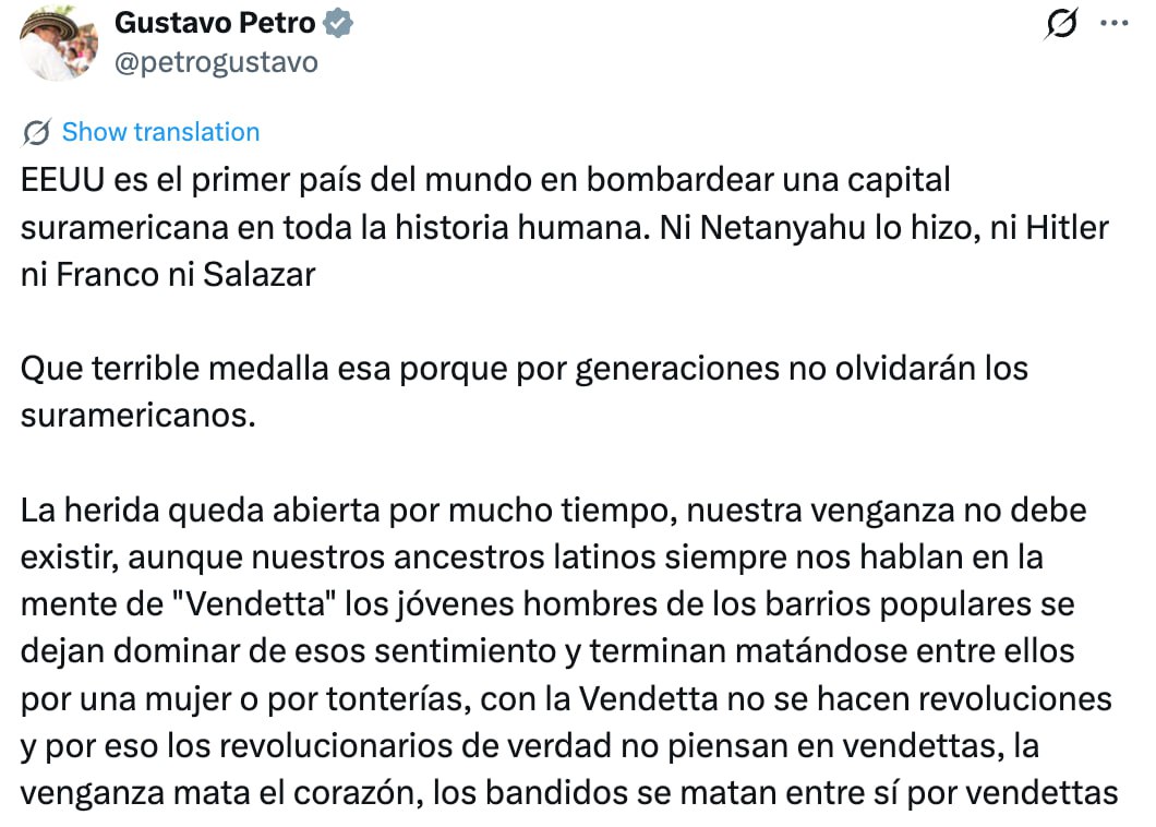 Президент Колумбии Густаво Петро сравнил американскую бомбардировку Каракаса с действиями гитлеровской Германии.