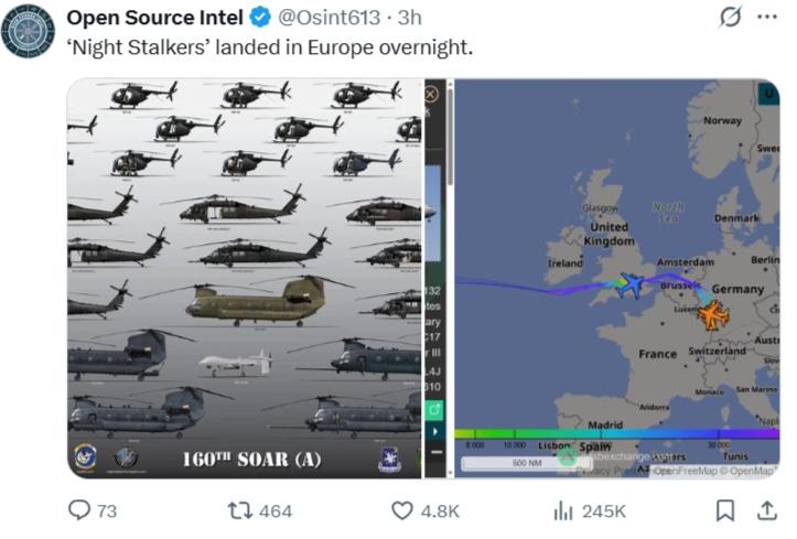 Министерство войны США этой ночью совершило переброс 160-го отряда специального назначения «Ночные охотники» в Европу - того самого отряда специального назначения, который совершил рейд на Мадуро в Венесуэле.