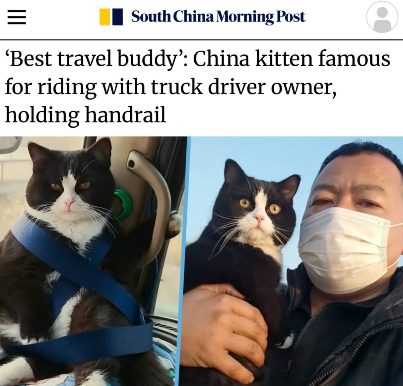 «В Китае настоящей звездой интернета стал кот, который сопровождает своего хозяина в дальнобойных рейсах. Восьмимесячного питомца по кличке Цзяоцзы сравнивают с кондуктором или вторым пилотом. Хозяин кота, дальнобойщик из провинции Хэбэй, называет кота своим «лучшим попутчиком».