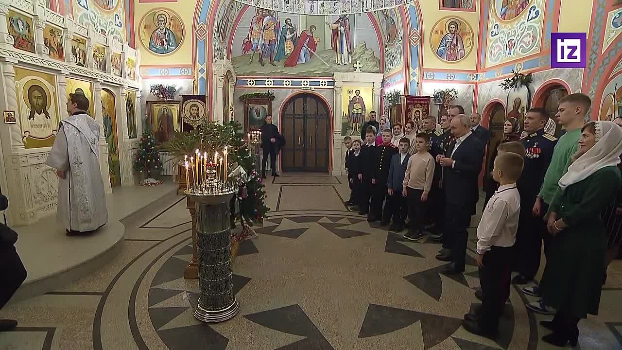 Владимир Путин во время Рождественского богослужения подобрал упавшую елочную игрушку и вернул ее на праздничную ель.