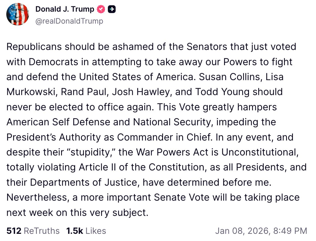 «Республиканцам должно быть стыдно за тех сенаторов, которые только что проголосовали вместе с демократами, пытаясь лишить нас полномочий вести боевые действия и защищать Соединённые Штаты Америки. Сьюзан Коллинз, Лиза Мурковски, Рэнд Пол, Джош Хоули и Тодд Янг больше никогда не должны избираться на государственные должности. Этот голос серьёзно подрывает самооборону и национальную безопасность США, ограничивая полномочия президента как главнокомандующего.