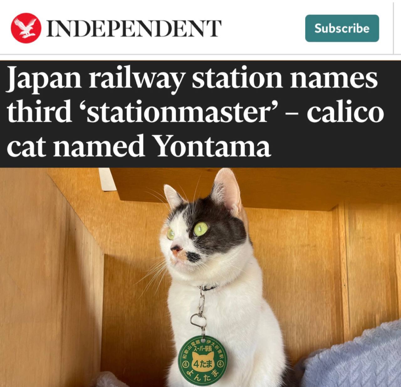 «В Японии трехцветную кошку по кличке Йонтама официально назначили смотрителем железнодорожной станции. Должность символическая, так как кошка прежде всего является дружелюбным талисманом железнодорожной линии и привлекает внимание посетителей. Впервые на линию Кигисава (принадлежит компании Wakayama Electric Railway Co) широкая общественность обратила внимание в 2007 году, так как на пост смотрителя вокзала назначили кошку по кличке Тама.