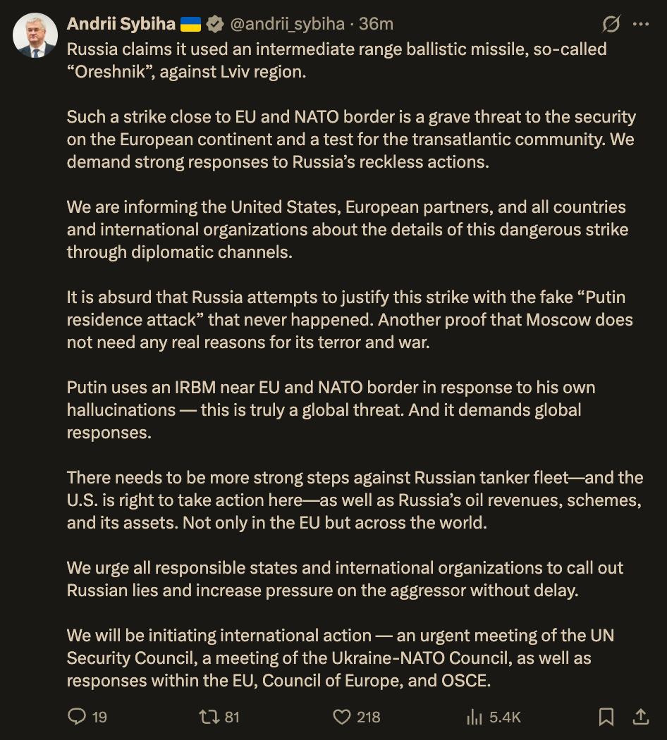 «Применение Россией ракеты средней дальности «Орешник» по Львовской области, в вблизи границ ЕС и НАТО, является серьезной угрозой безопасности на европейском континенте и испытанием для трансатлантического сообщества. Мы требуем жесткого ответа на безрассудные действия России»