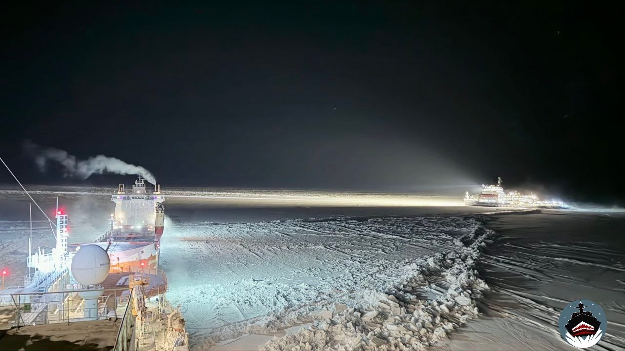 Встреча атомных ледоколов "Сибирь", который осуществляет проводку тх "Норильский никель" из порта Певек на Чукотке в порт Дудинка на реке Енисей, и атомного ледокола "Арктика", который идет на Восток, на Чукотку.