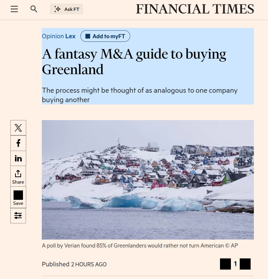 «Загвоздка в том, что слияние США и Гренландии на самом деле больше похоже не на прямое поглощение, а на сделку с использованием денежных средств и акций, где "акции" подразумевают получение гражданства США.Вот в чём проблема Трампа. США богаты и могущественны. Но если говорить о том, что они могут служить примером для подражания, то они далеки от идеала: ожидаемая продолжительность жизни ниже, чем у других стран, здравоохранение в два раза дороже, чем в Дании, а количество убийств с применением огнестрельного оружия в 65 раз выше.